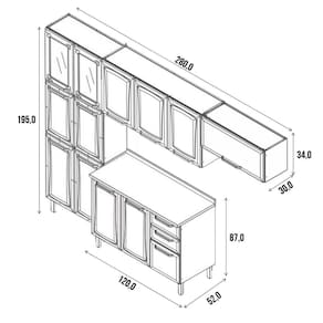Dimensões do produto montado: Altura 1,95 | Largura 2,80 | Profundidade: paneleiro 0,30 ? armário aéreo 3 portas 0,30 ? armário aéreo 1 porta 0,30 - balcão 0,52