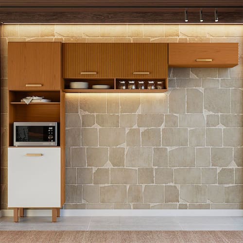 A Cozinha Compacta 5 portas com paneleiro duplo Maia Poliman foi desenvolvida para trazer um designer moderno com qualidade e praticidade ao seu ambiente. Composta por um paneleiro com espa?o para micro-ondas -A. 48cm x L. 57cm x P.36 cm- al?m de 2 portas de bater e nicho decorativo. O arm?rio a?reo possui 2 portas de bater no ripado gr?fico detalhe que traz beleza e sofistica??o ao produto. O arm?rio a?reo 1 porta basculante tem pist?o a g?s permitindo uma abertura mais suave que mant?m a porta suspensa para melhor aproveitamento de espa?o que pode ser utilizado sobre fog?o ou geladeira. Possui puxadores em pol?mero ouro fosco, dobradi?as refor?adas de 35mm e p?s PVC 17cm regul?veis ao piso permitindo o nivelamento perfeito na montagem. Produto em MDP com portas acabamento pintura UV. Produto ecologicamente correto com embalagem preparada para evitar avarias e permitir que o produto chegue em perfeito estado em sua casa. Perfeita combina??o com os mais variados ambientes. Qualidade que s? a Poliman oferece em seus produtos.