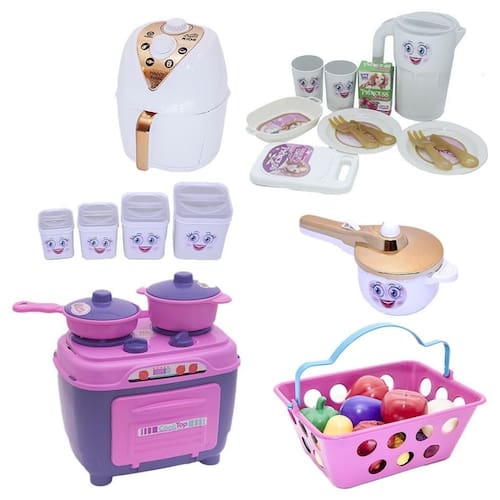 O kit vem com fogão com panelas, mercadinho, jogo de jantar, panelinha de pressão, air fryer, potinhos de mantimentos