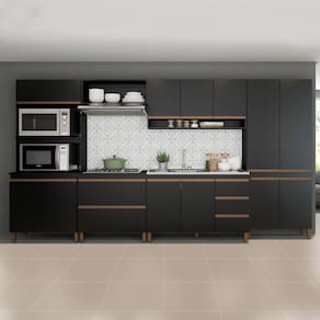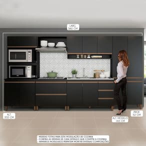 Cozinha Menu Móveis Sabrina 360x202cm 6 Peças Torre Preto Preto A Cozinha Modulada Sabrina foi desenvolvida para atender todas as suas necessidades do dia a dia com um design moderno, cheio de atitude, personalidade, funcionalidade, beleza e versatilidade. A Cozinha preta e a tendencia do momento e foi arquitetada com modulos uteis que vao facilitar a sua rotina diaria nos preparos dos alimentos e armazenamento dos utensilios e mantimentos, mantendo sua cozinha sempre organizada. Por se tratar de armarios de cozinha modulados voce pode ajustar os modulos conforme o espaco disponivel e montar diversas modulacoes diferentes para deixar o ambiente muito mais aconchegante. A elegancia fica por conta dos puxadores em perfil e os pes na cor bronze dando um toque unico de sofisticacao. A Cozinha Sabrina e produzida com materiais de excelente qualidade, garantindo a durabilidade e vida util. O melhor em moveis no design atual aliando conforto, qualidade e otimos precos, so na Menu Moveis! Caracteristicas: Produzida em MDP de 15 mm Acabamento UV na cor Preto Texturizado Portas com Dobradica Metalica Porta Basculante com Pistao a Gas Gavetas com Corredica Telescopica Puxadores Perfil PVC na cor Bronze Pes Regulares ABS na cor Bronze Balcao para Cooktop possui Tampo com Ranhura que pode ser utilizado com Cooktop de 5 bocas, caso nao cortar pode utilizar normalmente NAO acompanha TAMPO e PIA