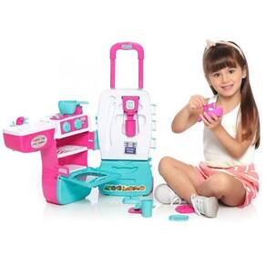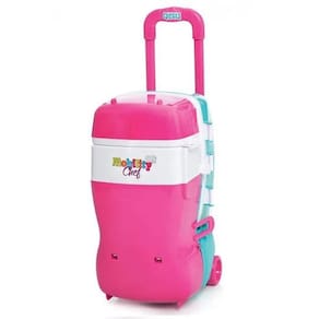 Esta super maleta se transforma em uma cozinha completa! Tem fogão, forninho, pia e uma geladeira. A brincadeira fica completa com panelinhas, pratinhos e talheres e frutas, e caixinhas.