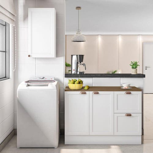 Informações Complementares: Portas de bater almofadadas/molduradas em MDF, balcão com tampo, corrediças telescópicas, dobradiças de 35mm, prateleiras internas, puxadores retro em polímero, pés PVC reguláveis 14,5cm, rodapés removíveis com presilhas modelo click.