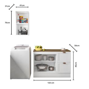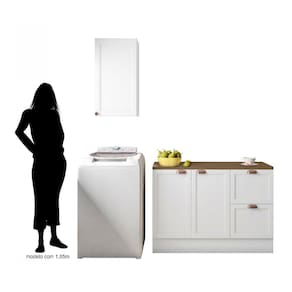 Medida de cada item (A x L x P): Aéreo 1 Porta: 76cm x 41cm x 31cm | Balcão 2 Portas 2 Gavetas com Tampo: 86cm x 120cm x 50cm.