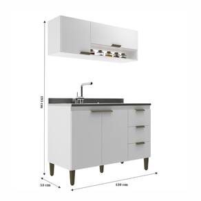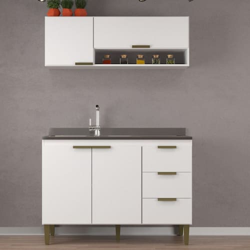 Características: Estrutura em MDP 2 Peças Corrediças metálicas Puxadores perfil Pés em polipropileno Altura dos pés: 17 cm Gaveta suporta até 5 kg Prateleiras suporta até 10 kg Não acompanha pia