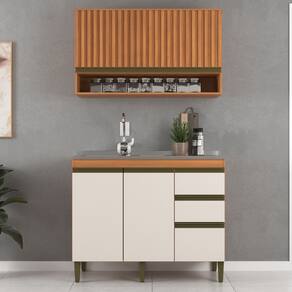 Características: Estrutura em MDP 2 Peças Corrediças telescópicas Puxadores perfil Detalhes ripados Pés em polipropileno Altura dos pés: 17 cm Gaveta suporta até 5 kg Prateleiras suporta até 10 kg Não acompanha pia