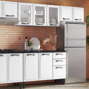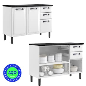 O Balcão possui 3 Portas e 2 Gavetas, o Armário Aéreo possui 3 Portas e duas prateleiras com espaço ideal para guardar mantimentos, panelas, potes, utensílios outros objetos que são essenciais no preparo de suas receitas.