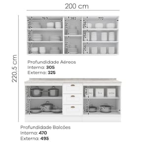 Conceito inspirado nas clássicas cozinhas estilo americano. Um conjunto modular com 6 peças: 1 balcão de pia 120 cm (com tampo de 120 cm), 1 balcão de 80 cm (com tampo de 80 cm), 1 armário aéreo de 120 cm e 1 armário aéreo de 80 cm. Estrutura feita em MDF de 15mm (fundo com 3mm e tampos em MDP de 25mm), com portas equas com dobradiças metálicas de 35 mm e amortecimento, sendo 2 portas com vidro. Conta com 7 prateleiras internas que suportam até 8 kg cada. Acabamento em pintura UV texturizada fosca. Portas e gavetas com usinagem em baixo relevo, e puxadores em metal zamac. Instalação suspensa opcional com ferragens inclusas. Produto entregue em 06 volumes.