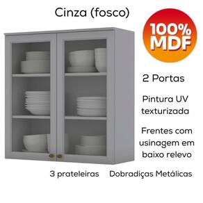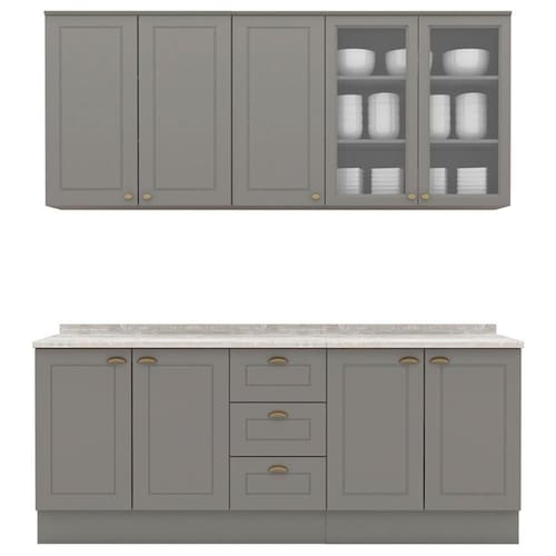Conceito inspirado nas clássicas cozinhas estilo americano. Um conjunto modular com 6 peças: 1 balcão de pia 120 cm (com tampo de 120 cm), 1 balcão de 80 cm (com tampo de 80 cm), 1 armário aéreo de 120 cm e 1 armário aéreo de 80 cm. Estrutura feita em MDF de 15mm (fundo com 3mm e tampos em MDP de 25mm), com portas equas com dobradiças metálicas de 35 mm e amortecimento, sendo 2 portas com vidro. Conta com 7 prateleiras internas que suportam até 8 kg cada. Acabamento em pintura UV texturizada fosca. Portas e gavetas com usinagem em baixo relevo, e puxadores em metal zamac. Instalação suspensa opcional com ferragens inclusas. Produto entregue em 06 volumes.