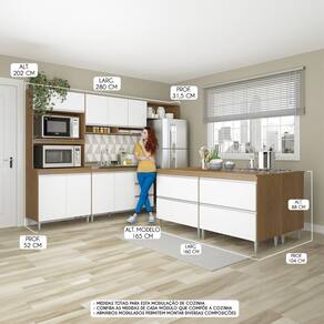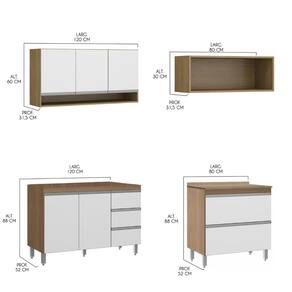 MÓDULOS INCLUSOS NA COZINHA: 1 x Armário Nicho - Larg. 80cm Alt. 202cm Prof. 31,5/52cm P. 44kg 1 x Armário Aéreo - Larg. 120cm Alt. 60cm Prof. 31,5 cm P. 26kg 1 x Balcão Pia - Larg. 120cm Alt. 88cm Prof. 52cm P. 36kg 1 x Nicho - Larg. 80cm Alt. 30cm Prof. 31,5cm P. 8kg 4 x Balcão Gavetão - Larg. 80cm Alt. 88cm Prof. 52cm P. 30kg