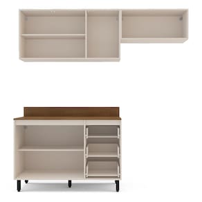 Caracteristicas: 3 Gavetas com corredicas telescopicas 6 Portas com dobradicas metalicas sendo uma basculante com pistao gas 2 Prateleiras interna que suportam 5kg cada Acabamento em FF e pintura UV Base aereos e balcao suportam 10kg cada Design moderno Estrutura em MDP 15mm Gavetas que suportam 3kg cada Possui pes regulaveis Tampo de 120 cm que suporta 15kg