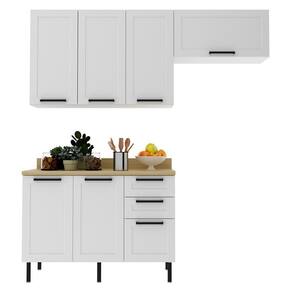 Conjunto de cozinha 04 peças, composto por dois armários aéreos (120cm e 80cm) e um balcão para pia com tampo. Balcão e Armários Aéreos compostos por estrutura 100% MDF 15mm com acabamento em pintura BP (brilho) e Tampo de 30mm com acabamento em pintura BP (semibrilho). Conta com 5 portas equipadas com dobradiças de 35 mm com amortecimento slow motion, Aéreo de 80cm com porta basculante e duplo pistão a gás, com detalhes em usinagem de baixo relevo no estilo provençal. Balcão com 3 gavetas com corrediças telescópicas (sendo uma com divisor de talheres), puxadores em alumínio e pés reguláveis em PVC com altura de 17 cm e detalhe cromado. Excelente para quem busca um móveis funcionais e ótimo desempenho. Este móvel chegará na sua casa separado em 06 volumes.