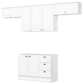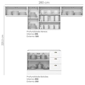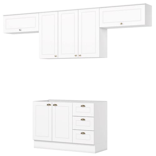 Conceito inspirado nas clássicas cozinhas estilo americano. Um conjunto modular de cozinha sendo 4 peças: 1 balcão de pia 120 cm (sem tampo)(NÃO ACOMPANHA PIA), 1 armário aéreo de 120 cm e 2 armário aéreo basculante de 80 cm. Todo o conjunto com estrutura feita 100% MDF de 15mm (fundo com 3mm), portas com dobradiças metálicas 35 mm com amortecimento e fechamento suave, total de 4 prateleiras suportando até 8 kg. Todo o conjunto com acabamento em pintura UV texturizada (fosco), portas e gavetas com detalhes de usinagem em baixo relevo, além do destaque em seus puxadores em metal zamac. Opção de instalação sem pés, suspenso (ferragens para fixação na parede inclusas). Este móvel chegará na sua casa separado em 04 volumes.