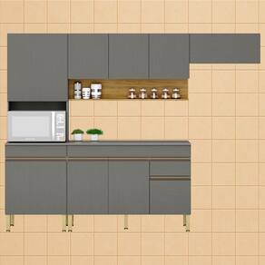 Cozinha Modulada 4 Peças, estilo moderno em módulos que se adaptam ao seu espaço! Produzido em MDP (15mm) com acabamento em pintura UV texturizada. Composta por 09 portas totais (sendo uma delas basculante e superiores com sistema passante), gaveta com corrediças telescópicas, nicho decorativo e nicho para microondas/forno, prateleiras internas, passa fio embutido e puxadores em perfil alumínio (portas inferiores). Os pés reguláveis são em plástico resistente. Este produto será entregue em 06 volumes.