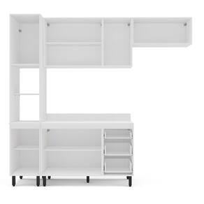 A Cozinha Modulada 4 Pecas com Tampo Amara Politorno Moveis une modernidade, funcionalidade e otimo aproveitamento de espaco. Conta com balcao de 3 gavetas e 2 portas, paneleiro com 2 portas, 3 armarios aereos e 1 basculante, oferecendo amplo armazenamento. Estruturada em MDF/MDP com acabamento em pintura UV semi-fosco, possui puxadores em aluminio e gavetas com corredicas telescopicas. Acompanha tampo, pes regulaveis e sapatas niveladoras, garantindo qualidade, durabilidade e facilidade na instalacao.