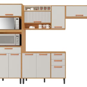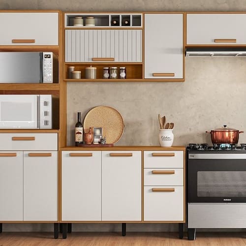 A Cozinha Modulada Itatiaia 4 Peças Napoles possui 09 portas, 3 gavetas, 1 Nicho, 1 Garrafeiro e 2 Nichos Para Fornos ou Eletro, corpo e portas em MDP 15cm, portas com acabamento Pimtura UV, puxadores exclusivos com acabamento fosco na cor rose gold, Além de bonitos, são resistentes e anatômicos. Gavetas com corrediças telescópicas, que abrem suavemente e têm trava de segurança para não deixar cair a gaveta. Tampo de 25cm com acabamento especial que suporta temperatura de até 120ºC, mais rapidez, funcionalidade e conforto no preparo das seus receitas. Espaço especialmente pensado para comportar o eletro, proporcionando melhor organizaçõa para a cozinha. Porta do Armário de 120cm em aço ripado maior durabilidade e beleza trazendo modernidade, resistência e segurança ao produto. Acabamento da Prateleira: Pintura Escala de Brilho da Prateleira: Fosco Acabamento da Gaveta: Pintura Escala de Brilho da Gaveta: Fosco Material do Puxador da Gaveta: Plástico Acabamento da Porta: Pintura Escala de Brilho da Porta: Fosco Material do Puxador da Porta: Plástico Acabamento dos Pés: Polipropileno Acompanha Tampo: Sim Altura dos Pés: 16 cm Altura Máxima dos Pés: 16.0000 Ambiente Principal: Cozinha Balcão Suporta Pia: Sim codigo_ean: 7900288103895 Complexidade da Montagem: Alta: deve ser montado por um montador especializado Cor: Cinamomo/Off White Cor do Produto: Cinamomo/Off White Cor Interna: Cinamomo Escala de Brilho: Fosco Espessura do Tampo: 25 mm Gaveta com Chave: Não Itens Inclusos: 1 Paneleiro + Armario + Armario Gel + Balcão Linha ou Coleção: Napoles Manual de Montagem e Instalação: https://product-hub-prd.madeiramadeira.com.br/983461/documents/23104e13-1e3d-4f65-b4e8-7b2a8e58d5212771457267917431847464462.pdf Marca: Itatiaia Material da Dobradiça/Corrediça da Porta: Metálica Material da Gaveta: MDP Material da Porta: MDP Material da Prateleira: MDP Material do Fundo: HDF Material do Tampo: MDP Material dos Pés: Polipropileno Medida de cada item (A x L x P): Paneleiro (220x70x53) Armario 120 (68x120x29) Armario Gel (34x80x29) Balcão 120 (88x120x53) modular: Sim Necessita Montagem: Sim O Balcão Acompanha Pia: Não Origem do Produto: Nacional Pés Reguláveis: Sim Peso: 130 kg Peso Máximo por Gaveta: 5 kg Peso Máximo por Prateleira: 12 kg Possui Pés: 09 Possui Portas: Sim Possui Prateleiras: Sim Possui recorte para Cooktop: Não Possui Rodízio: Não Possui Vidro: Não Produto Montado: Sim Recomendações de Uso, Manutenção e Limpeza: Limpeza com Pano Umidecido Sapatas Niveladoras: Sim Sistema de Montagem: Parafuso/ Cavilha Suporta Até (kg): 230 kg Tamanho Indicado da Pia: 120x53 Tipo de Corrediça da Gaveta: Metálica Telescópica Tipo de Dobradiça da Porta: Simples Tipo de Puxador da Gaveta: Externo Tipo de Puxador da Porta: Externo