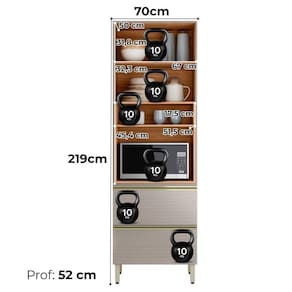 A Cozinha Modulada DP2703 entrega praticidade, durabilidade e estética moderna para o espaço. São 4 peças, produzidas 100% em MDF (20/15 mm) com acabamento em pintura UV. Possui portas com dobradiças metálicas de 35 mm (sendo 4 basculantes com pistão a gás, 1 com detalhes ripado baixo relevo e 2 em vidro Reflecta 3 mm), gavetas laterais (uma com divisor de talheres) e gavetão inferior, todas equipadas com corrediças telescópicas. Conta ainda com pés com regulagem de altura, puxadores em alumínio, nicho decorativo funcional, tampo em MDF 20mm e espaço para micro-ondas ou forno (até A.45,4 cm x L.67 cm x P.51,5 cm). Este produto será entregue em 08 volumes.