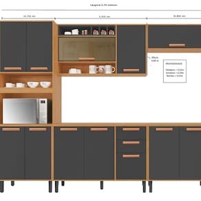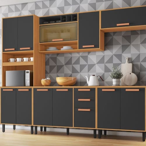 A Cozinha Modulada Itatiaia Napoles 5 Peças possui 14 portas, 2 gaveta, 3 Nichos, 1 Garrafeiro e Nicho Para Forno, corpo e portas em MDP 1,5cm, portas com acabamento Pimtura UV, puxadores exclusivos com acabamento fosco na cor rose gold, Além de bonitos, são resistentes e anatômicos. Gavetas com corrediças telescópicas, que abrem suavemente e têm trava de segurança para não deixar cair a gaveta. Tampo de 2,5cm com acabamento especial que suporta temperatura de até 120ºC, mais rapidez, funcionalidade e conforto no preparo das seus receitas. Espaço especialmente pensado para comportar o eletro, proporcionando melhor organizaçõa para a cozinha. Porta do Armário de 120cm em vidro reflecta, beleza trazendo modernidade, resistência e segurança ao produto. Acabamento da Prateleira: Pintura Escala de Brilho da Prateleira: Fosco Acabamento da Gaveta: Pintura Escala de Brilho da Gaveta: Fosco Material do Puxador da Gaveta: Plástico Acabamento da Porta: Pintura Escala de Brilho da Porta: Fosco Material do Puxador da Porta: Plástico Acabamento dos Pés: Polipropileno Acompanha Tampo: Sim Altura dos Pés: 16 cm Altura Máxima dos Pés: 16.0000 Ambiente Principal: Cozinha Balcão Suporta Pia: Sim codigo_ean: 7900288102669 Complexidade da Montagem: Alta: deve ser montado por um montador especializado Cor: Cinamomo/Grafite Intenso Cor do Produto: Cinamomo/Grafite Intenso Cor Interna: Cinamomo Escala de Brilho: Fosco Espessura do Material da Estrutura: 15 mm Espessura do Tampo: 25 mm Gaveta com Chave: Não Itens Inclusos: 1 Cozinha + Manual de Montagem + Kit Ferragens Linha ou Coleção: Napoles Manual de Montagem e Instalação: https://product-hub-prd.madeiramadeira.com.br/983451/documents/b77a85d1-fa5a-4801-bea8-078f8a7c1d062770900267917431727855449.pdf Marca: Itatiaia Material da Dobradiça/Corrediça da Porta: Metálica Material da Gaveta: MDP Material da Porta: MDP Material da Prateleira: MDP Material do Fundo: HDF Material do Tampo: MDP Material dos Pés: Polipropileno Medida de cada item (A x L x P): Paneleiro (220x70x53) Armario 120 (68x120x29) Armario Gel (34x80x29) Balcão 120 (88x120x53) Balcão 80 (88x80x53) modular: Sim Necessita Montagem: Sim O Balcão Acompanha Pia: Não Origem do Produto: Nacional Pés Reguláveis: Sim Peso: 157 kg Peso Máximo por Gaveta: 5 kg Peso Máximo por Prateleira: 12 kg Possui Pés: 13 Possui Portas: Sim Possui Prateleiras: Sim Possui recorte para Cooktop: Não Possui Rodízio: Não Possui Vidro: Sim Produto Montado: Sim Recomendações de Uso, Manutenção e Limpeza: Limpeza com pano umedecido Sapatas Niveladoras: Sim Sistema de Montagem: PARAFUSO/CAVILHA Suporta Até (kg): 250 kg Tamanho Indicado da Pia: 120x53 Tipo de Corrediça da Gaveta: Metálica Telescópica Tipo de Dobradiça da Porta: Simples Tipo de Puxador da Gaveta: Externo Tipo de Puxador da Porta: Externo