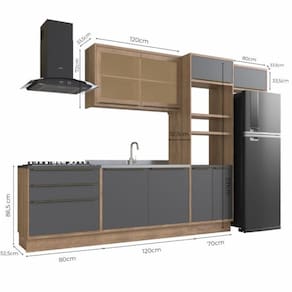 A cozinha modulada Viena é produzida 100% em MDF e agrega beleza e sofisticação ao ambiente. Esta opção de modulação conta com um balcão de 2 portas e um balcão com 3 gavetas, que possuem corrediças telescópicas, dispondo de uma maior abertura e um deslizamento suave e silencioso. Não acompanha tampo e pia. Acompanha divisor de talheres. Além disso, conta com uma Torre Quente de 2 portas e 1 basculante, que possui espaço ideal para forno ou micro ondas. Acompanha também um armário aéreo de 120 cm, com duas portas em vidro reflecta e um aéreo de 80 cm que possui 1 porta. Todos os puxadores são em alumínio champagne e as dobradiças possuem amortecimento, de modo que agregue resistência e funcionalidade ao produto. Além do mais, todas as portas e frentes das gavetas são em BP (Baixa Pressão). Altura do Conjunto: 231 cm Ambiente: null Ambiente Principal: Cozinha Cor: Louro Freijó/Cinza Grafitto Informação Complementar: 1x Armário Aéreo para Cozinha com Vidros Reflecta 120cm 2 Portas Viena Louro Freijó/ArgilaLargura: 120Altura: 72Peso: 32.5Profundidade: 33.5Necessita Montagem: Sim1x Balcão de Cozinha 80cm 3 Gavetas Viena Louro Freijó/GrafittoLargura: 80Altura: 86.5Peso: 35Profundidade: 52.5Necessita Montagem: Sim1x Torre Quente 4 Portas 1 Nicho para Forno Viena Louro Freijó/GrafittoLargura: 70Altura: 231Peso: 63.4Profundidade: 52.5Necessita Montagem: Sim1x Balcão de Cozinha 120cm 2 Portas Viena Louro Freijó/GrafittoLargura: 120Altura: 86.5Peso: 42Profundidade: 52.5Necessita Montagem: Sim1x Armário Aéreo para Cozinha 80cm 1 Porta Viena Louro Freijó/GrafittoLargura: 80Altura: 35.5Peso: 12.4Profundidade: 33.5Necessita Montagem: Sim Possui Rodízio: Tamanho: