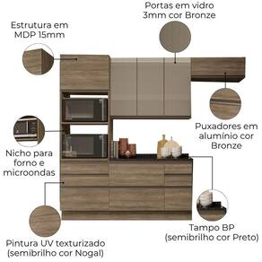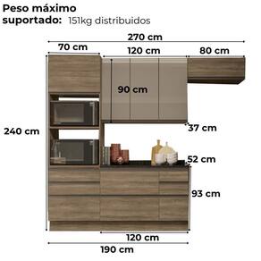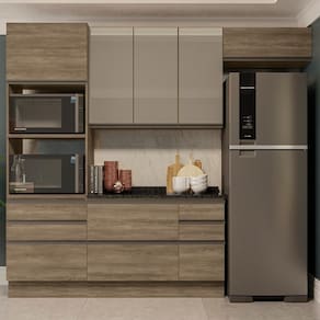 Beleza e eficiência que se complementam em um conjunto ideal para o dia a dia. Cozinha modulada Maxxi com 5 peças, composta por: 1 armário aéreo com 3 portas com vidro de 3 mm e 4 prateleiras internas; 1 armário aéreo de 80 cm com porta basculante; 1 torre quente para 2 fornos, com 1 porta basculante e 3 gavetas (sendo 1 gavetão); 1 balcão para pia de 120 cm, com 1 porta basculante e 4 gavetas, sendo 2 gavetões e 3 com frente em vidro de 3 mm; e 1 tampo 100% em MDP 25 mm BP (semibrilho) com sarrafo de reforço. Produzidos em MDP de 15 mm, com acabamento UV texturizado semibrilho. Puxadores em alumínio, dobradiças de 35 mm com amortecedor, corrediças telescópicas e pistões a gás completam o conjunto. Montagem flexível: suspenso ou com rodapé. Ideal para quem valoriza organização e visual moderno na cozinha. Este conjunto será entregue em 07 volumes.