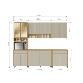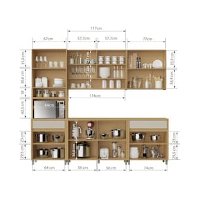 Caracteristicas: Corredicas telescopicas Nicho Vidro Reflecta com dobradicas Caneco 35 mm no paneleiro Material 100 em MDF Pes regulaveis de 10 cm Possui organizador de talheres Possui chapa Duratree, anti-mofo Puxadores ocultos Peso suportado por prateleiras 15kg Portas canelada nos armarios aereos 12 Portas 2 Gavetas