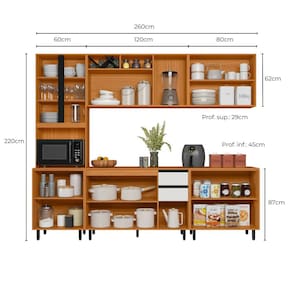 Compoe a cozinha: 1 Paneleiro cristaleira com 4 portas de bater, sendo 2 com vidro incolor e iluminacao em LED 1 Balcao de 120cm 3 Portas 2 Gavetas e acompanha tampo com 15mm de espessura 1 Armario aereo de 120cm 2 Portas e nicho garrafeiro 1 Armario aereo de 80cm 2 Portas 1 Balcao de 80cm 2 Portas
