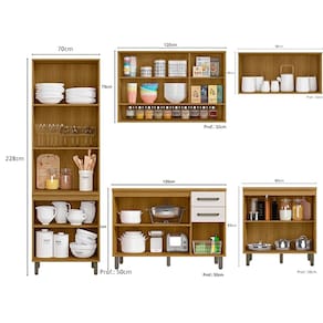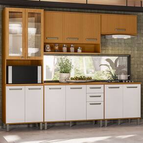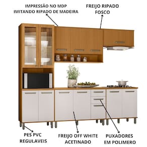 MDPConjunto de Cozinha Modulada 6 Peças, uma solução completa e sofisticada para o seu ambiente culinário. Fabricado em MDP de 15mm, com dobradiças metálicas reforçadas de 35mm e puxadores em polimero, este conjunto oferece durabilidade e resistência. Nele contém: 01 Armário aéreo possui uma porta basculante com pistão a gás e impressão ripado sendo impressão no MDP imitando ripado de madeira, proporcionando um design moderno e elegante. 01 Armário três portas com um nicho central, este armário oferece espaço adicional para organização, aliado ao charme da impressão ripado sendo impressão no MDP imitando ripado de madeira. 01 Paneleiro vertical que conta com quatro portas, duas delas em vidro, permitindo a exposição de itens decorativos ou utensílios especiais, 4 prateleiras internas e um compartimento especial para forno e micro-ondas (A.44cm x L.67cm x P.50cm) com pés em PVC reguláveis e 01 Balcão com Tampo que oferece amplo espaço de armazenamento com três portas e duas gavetas, acompanhadas de corrediças metálicas que proporcionam um manuseio suave com pés em PVC reguláveis e 01 Balcão Com tampo 80 cm duas portas com prateleira interna remóvivel. Este conjunto de cozinha destaca-se pela combinação de funcionalidade e estética, sendo uma excelente opção para quem busca renovar o ambiente com qualidade e bom gosto. Este móvel chegará em sua casa separado em 11 volumes.