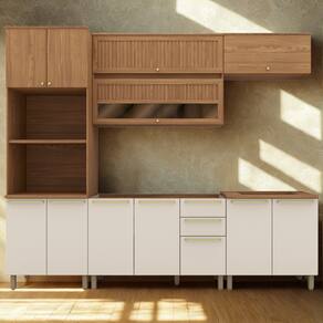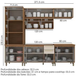 Linha Requinte combina modernidade e versatilidade, criando um ambiente charmoso e acolhedor com seus tons amadeirados. Cozinha Modulada Completa com 6 peças: 1 torre quente com espaços para 2 fornos, 2 armários aéreos (aéreo 120 cm, aéreo basculante 80 cm), 2 balcões (balcão de pia 120 cm e balcão 80 cm com tampo para fogão, usinado para Cooktop de 4 bocas com pré marcação para Cooktop de 5 bocas)(NÃO ACOMPANHA FOGÃO COOKTOP). O conjunto conta com estrutura 100% MDP de 15mm (fundo em MDF de 3mm), 12 portas totais com dobradiças metálicas de 25mm e amortecimento, e 2 gavetas com corrediças telescópicas, puxadores em alumínio (dourado) e pés em plásticos ABS com altura regulável, além de contar com 3 prateleiras internas suportando até 8kg. Conjunto com acabamento em pintura UV texturizada, que oferece sofisticação e facilidade na limpeza. Este conjunto chegará em sua casa separado em 6 volumes.