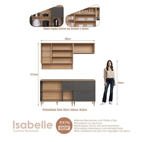 Cozinha modulada Isabelle com tampo 120cm possui surpreendente espaço interno, design e cores sofisticadas que combinam perfeitamente com qualquer decoração. As gavetas possuem corrediças telescópicas, as portas basculantes contam com dobradiças com amortecimento e pistão à gás para o fechamento suave. Possui prateleiras internas. Com puxadores em alumínio com ponteira ABS e pés modernos com regulagem de altura. Esses itens de qualidade superior conferem durabilidade e maior vida útil ao móvel. Composta de chapa MDP 15cm e 25cm. Os módulos são avulsos (cada peça é independente uma da outra) e podem ser arranjados de diferentes formas, o que permite que, nesse caso, você monte uma cozinha do seu jeito. Acabamento da Prateleira: Finish Foil Escala de Brilho da Prateleira: Fosco Acabamento da Gaveta: Finish Foil Escala de Brilho da Gaveta: Fosco Material do Puxador da Gaveta: Alumínio Acabamento da Porta: Finish Foil Escala de Brilho da Porta: Fosco Material do Puxador da Porta: Alumínio Acabamento dos Pés: Polipropileno Acompanha Rodapé Decorativo: Não Acompanha Tampo: Sim Altura dos Pés: 17 cm Altura Máxima dos Pés: 17.0000 Ambiente Principal: Cozinha Balcão Suporta Pia: Sim codigo_ean: 7900288283955 Complexidade da Montagem: Alta: deve ser montado por um montador especializado Cor: Freijó / Grafite Cor do Produto: Freijó / Grafite Cor Flex: Não Cor Interna: Freijó Escala de Brilho: Fosco Espessura do Material da Estrutura: 15 mm Espessura do Tampo: 25 mm Gaveta com Chave: Não Informações Complementares: Cada módulo Itens Inclusos: 1 Cozinha Completa, Manual de Montagem e Kit Ferragens Linha ou Coleção: Isabelle Manual de Montagem e Instalação: https://product-hub-prd.madeiramadeira.com.br/421376193/documents/cf024342-4499-434d-8b47-9c355386e4353307593498917619294547112.pdf Marca: Delmarco Móveis Material da Corrediça: Alumínio Material da Dobradiça/Corrediça da Porta: Alumínio Material da Gaveta: MDP Material da Porta: MDP Material da Prateleira: MDP Material do Fundo: MDF Material do Tampo: MDP Material dos Pés: Polipropileno Medida de cada item (A x L x P): IS1630 – Aéreo – 75,5x119,9x36,8cm IS1500 – Balcão – 95x119,8x52cm IS1650 – Nicho – 22,5x119,8x15,5cm IS1611 – Aéreo – 37,7x79,9x36,8cm IS1511 – Balcão – 95x80x52cm modular: Sim Montagem Flex: Não Necessita Montagem: Sim O Balcão Acompanha Pia: Não Origem do Produto: Nacional Pés Reguláveis: Sim Peso: 130,46 kg Peso Máximo por Gaveta: 5 kg Peso Máximo por Prateleira: 5 kg Possui Pés: 09 Possui Portas: Sim Possui Prateleiras: Sim Possui recorte para Cooktop: Não Possui Rodízio: Não Possui Vidro: Sim Produto Montado: Sim Recomendações de Uso, Manutenção e Limpeza: Limpar com um pano levemente úmido ou seco, não utilizar produtos químicos Sapatas Niveladoras: Não Sistema de Montagem: Parafusos, cavilhas e minifix Suporta Até (kg): 25 kg Tamanho Indicado da Pia: 1.20m Tipo de Corrediça da Gaveta: Metálica Telescópica Tipo de Dobradiça da Porta: Soft close Tipo de Puxador da Gaveta: Externo Tipo de Puxador da Porta: Externo
