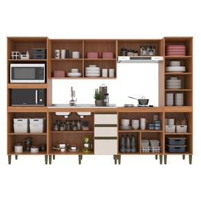 Caracteristicas: 3 Gavetas com corredicas telescopicas 2 Nichos para forno ou micro-ondas 12 Portas com dobradicas metalicas 9 Prateleiras internas Altura dos pes 17cm Espessura Chapa 15mm Estrutura em MDP Perfect Nao acompanha pia Pes em polipropileno Puxador perfil Sistema de montagem parafusos philips