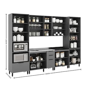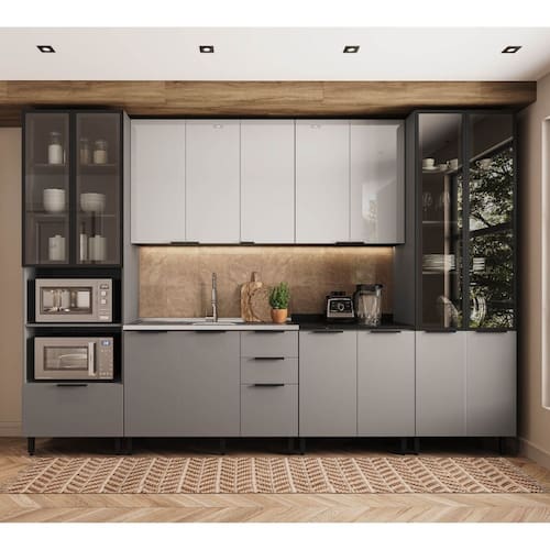Características: Estrutura MDP revestido em FF 15 Portas sendo quatro com vidro 4 Gavetas 2 Nichos 14 Prateleiras internas Dobradiças metálicas com amortecimento Corrediças telescópicas Prateleiras que suportam até 6kg Prateleiras que suportam até 22kg Gavetas que suportam até 3kg Gavetas que suportam até 5kg Puxadores Alumínio Pés reguláveis Acabamento Pintura UV Não acompanha pia