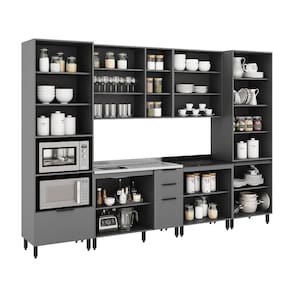 Características: Estrutura MDP revestido em FF 15 Portas sendo quatro com vidro 4 Gavetas 2 Nichos 14 Prateleiras internas Dobradiças metálicas com amortecimento Corrediças telescópicas Prateleiras suporta de 6kg até 22kg Gavetas suporta de 3kg a 5kg Puxadores Alumínio Pés reguláveis Acabamento Pintura UV Não acompanha tampo