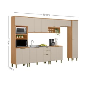 Características: Estrutura: 100 MDF 15 Portas Sendo 13 de Abrir e 2 Basculante 2 Gavetas 10 Prateleiras 17 Pés de Plástico 17 Puxadores 4 Nichos Corrediças telescópicas Dobradiças metálicas Tampo que Suporta: 40kg Prateleiras que Suportam: 5kg Prateleira que Suporta: 8kg Prateleiras que Suportam: 15kg Prateleiras que Suportam: 20kg Gavetas que Suportam: 5kg