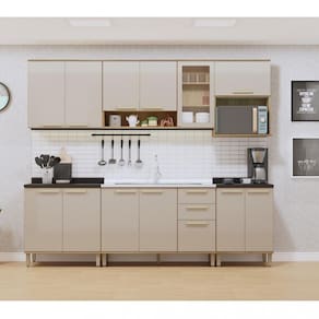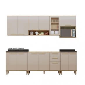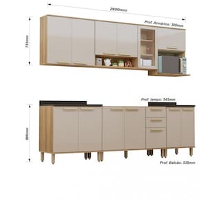 Dimensões do Produto: Altura armários superiores: 73,3 cm Largura total: 260 cm Profundidade balcões: 53,5 cm Profundidade armário superiores: 30cm Peso: 197,40 kg