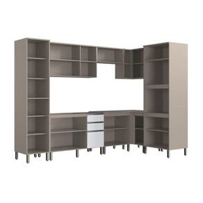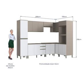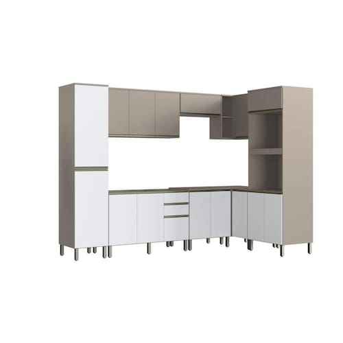 Cozinha modulada Diamante New 8 peças na cor fume/fume branco. Cozinha com aéreo 120 três portas, balcão 120 com duas portas e três gavetas, paneleiro 45, kit forno e microondas, balcão de 70 2 portas e aéreo de 70 basculante, aéreo canto reto e balcão canto reto. Dobradiças com amortecedor, puxador em alumínio com ponteiras de zamac, portas em MDF.
