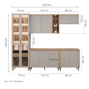 O conjunto e composto por Cristaleira de 70 cm com LED e duas portas, Balcao de Cozinha de 120 cm sem tampo, Balcao de 80 cm sem tampo, Armario Aereo de 120 cm com LED e nicho decorativo e Armario Basculante de 80 cm. A cristaleira valoriza a decoracao e facilita a organizacao de utensilios, enquanto os balcoes ampliam a area de apoio e armazenamento. Os armarios superiores garantem praticidade no dia a dia, e a iluminacao em LED proporciona charme e conforto visual ao ambiente.