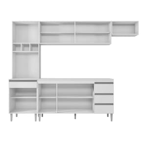 A Cozinha Modulada 5 Peças é a escolha ideal para quem busca conferir modernidade e sofisticação ao ambiente. Sua estrutura é composta por MDP, apresentando um acabamento com pintura UV. Este conjunto conta com 12 portas articuladas equipadas com dobradiças metálicas, incluindo uma basculante com pistão a gás. Dispõe de espaço para micro-ondas ou outros aparelhos domésticos, 3 nichos garrafeiros, 4 gavetas com corrediças telescópicas de deslize suave, balcão com tampo resistente em MDP, prateleiras internas para a organização de utensílios, puxadores em alumínio e acompanham pés em PVC com regulagem.