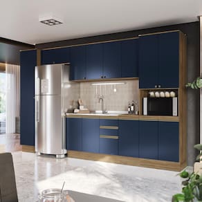 A perfeita união entre estilo e qualidade você encontra no Combo CB1082 da Cozinha Celeste da Kappesberg. Produzida em chapa MDF de 15mm, ela garante robustez, firmesa e qualidade, além de um acabamento perfeito. E com sete camadas de pintura tanto na parte interna quanto na externa, a caixaria possui pintura touch na cor nogueira, contando com a textura dos veios da madeira, enquanto que as frentes, com pintura na cor azul profundo, possui acabamento fosco. Uma combinação marcante e moderna, que dará ainda mais destaque ao seu espaço, deixando sua cozinha perfeita. Com oito módulos mais tampo, o conjunto possui 2,30m de altura e 3,60m de largura, combinando estilo e qualidade para todos os ambientes. E com amplo espaço interno e módulo para forno ou microondas, você poderá organizar louças e mantimentos, além de preparar receitas especiais e deliciosas para receber sua família ou amigos. E para um melhor acabamento, a cozinha possui rodapés, mas também acompanha as ferragens para ser montada suspensa, do jeito que você preferir. Os diferenciais ficam por conta das dobradiças com amortecimento, garantindo um fechamento suave e sem ruídos, das corrediças telescópicas e os puxadores na cor dourada, complementando o estilo e qualidade do produto. Viva momentos especiais e renove seu espaço com a Cozinha Celeste da Kappesberg.