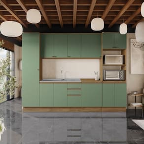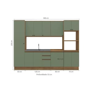 A perfeita união entre estilo e qualidade você encontra no Combo CB1084 da Cozinha Celeste da Kappesberg. Produzida em chapa MDF de 15mm, ela garante robustez, firmeza e qualidade, além de um acabamento perfeito. E com sete camadas de pintura tanto na parte interna quanto na externa, a caixaria possui pintura touch na cor nogueira, contando com a textura dos veios da madeira, enquanto que as frentes, com pintura na cor verde oliva, possui acabamento fosco. Uma combinação linda e moderna, que garantirá mais luminosidade e aconchego ao espaço, deixando sua cozinha perfeita. Com seis módulos mais tampo, o conjunto possui 2,30m de altura e 3m de largura, combinando estilo e qualidade para todos os ambientes. E com amplo espaço interno e módulo para forno e microondas, você poderá organizar louças e mantimentos, além de preparar receitas especiais e deliciosas para receber sua família ou amigos. E para um melhor acabamento, a cozinha possui rodapés, mas também acompanha as ferragens para ser montada suspensa, do jeito que você preferir. Os diferenciais ficam por conta das dobradiças com amortecimento, garantindo um fechamento suave e sem ruídos, das corrediças telescópicas e os puxadores na cor dourada, complementando o estilo e qualidade do produto. Viva momentos especiais e renove seu espaço com a Cozinha Celeste da Kappesberg.