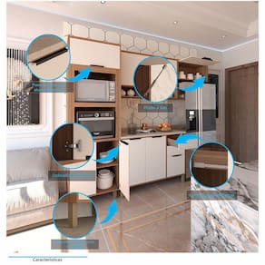 Informações Complementares Portas Basculantes com abertura auxiliada por Pistão a Gás 80N. Nichos decorativos. Pode ser utilizado com pia, porém não acompanha o produto. Espaço duplo para Forno e Micro-ondas. ATENÇÃO: Na utilização de FORNO ELÉTRICO/GÁS é obrigatória a retirada do fundo -risco de super aquecimento-. As dimensões máximas do forno devem respeitar a margem de respiro, necessitando folga de 5cm entre forno e laterais do móvel. Suporta até: 5kg nas gavetas, 9kg nas prateleiras e 15kg na base para eletros. Distribua uniformemente os objetos.