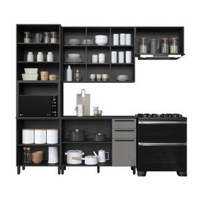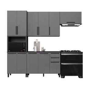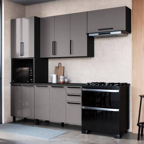 Materiais do corpo: MDP | Altura (cm): 240 | Largura (cm): 270 | Quantidade de portas: 11 | Conteúdo da embalagem: Torre quente, Aéreo 120cm, Aéreo 80cm, Balcão 120cm e Manual de Montagem. | Profundidade (cm): 53 | Tipo de móveis de cozinha: Cozinha Compacta | Inclui manual de montagem: Sim | Requer montagem: Sim | Marca: Fidelitá Móveis | Estilo: Moderno | Condição do item: Novo | Modelo: Mônaco | Cor: Chumbo/Titânio