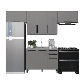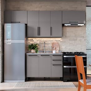 Fabricada em MDP de alta qualidade, possui pintura UV perolizada na sofisticada cor Titânio, dobradiças com slow motion, corrediças telescópicas, puxadores metálicos e pés com regulagem que permitem ajuste de altura em até 3cm. O diferencial desta versão está na possibilidade de personalização: o balcão de 120cm não acompanha tampo, ideal para instalação de pia, enquanto o balcão de 80cm já acompanha tampo fechado, pronto para uso.