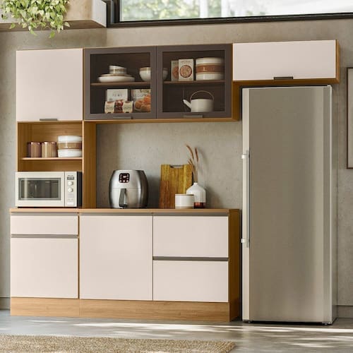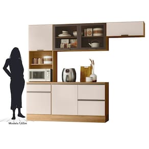 Medida de cada item (A x L x P): Paneleiro Duplo: A.215cm x L.58cm x P.SUP.37cm / P.INF.50cm | Aéreo 2 portas vidro: A.59cm x L.120cm x P.37cm| Aéreo Geladeira: A.30cm x L.80cm x P.37cm | Balcão 120cm com tampo: A.86cm x L.120cm x P.50cm.