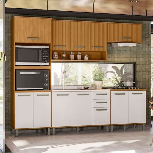 Informações Complementares: Portas com acabamento ripado gráfico, nicho para forno e micro-ondas, porta basculante com pistão a gás, balcão 120cm para pia sem tampo, dobradiças de 35mm, prateleiras, balcão duplo com tampo de 27mm e prateleira removível, corrediças telescópicas, puxa