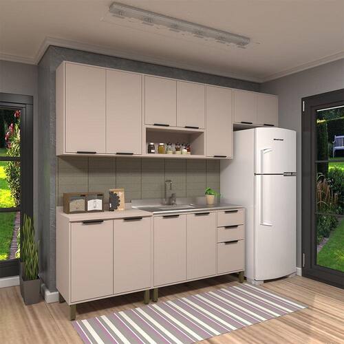 Desenvolvida com materiais de excelencia, a Cozinha Stylo oferece excelente distribuicao de espaco interno. E estruturada em 100 MDP e possui dobradicas slow motion com amortecedor incorporado para fechamento suave das portas. Conta com puxadores tipo aste em Aluminio Preto dando um toque especial de classe e elegancia.
