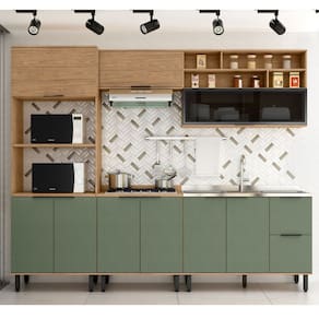 Como trata-se de uma cozinha modulada (Módulos Independentes), ela pode ser montada com um Layout diferente, dependendo do seu ambiente. Assim, se torna praticamente uma cozinha planejada para sua casa.