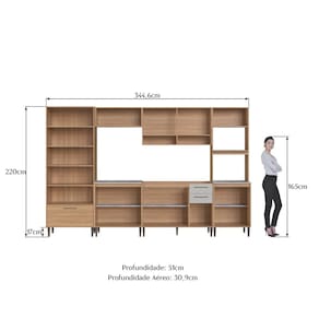 Medida de cada item (A x L x P): Cristaleira alt 220cm x larg 80cm x prof 51cm; Balcão alt 91cm x larg 120cm x prof 51cm; balcão alt 92,5cm x larg 80cm x prof 51cm; aéreo alt 67cm x larg 120cm x prof 31cm; aéreo alt 33,5cm x larg 80cm x prof 31cm; Torre de forno alt 220cm x larg 63cm x prof 51cm