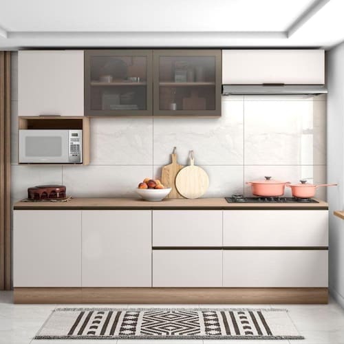 Itens Inclusos: Aéreo 1pt, aéreo nicho micro-ondas, aéreo 2pt vidro, aéreo geladeira, balcão 1pt, balcão 1pt 3gv, balcão 1pt 1gv, acessórios e manual de montagem.