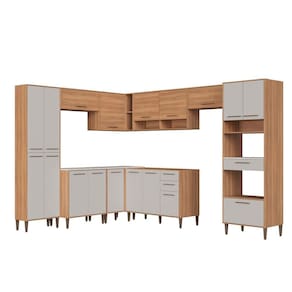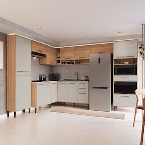 A Cozinha Modulada Jade Delmarco 9 peças de canto, com Torre Quente e Paneleiro Duplo, é uma cozinha que soma elegância com praticidade, presentando um design moderno e funcional, contemporânea, com linhas retas e combinação de cores neutras. Produzida toda em chapa em MDP de 15cm, revestido com perfect, traz excelente acabamento e qualidade. Possui dobradiças com amortecimento, puxadores em alumínio com boa ergonomia, pés com niveladores de piso, altos e visíveis nos móveis, facilitando a limpeza. Possui paneleiro duplo com amplo espaço de armazenamento, 2 nichos embutidos para micro-ondas/forno elétrico, prateleiras abertas decorativas. Esses itens de qualidade superior conferem durabilidade e maior vida útil ao móvel. É o produto perfeito para abrilhantar seu espaço da cozinha.