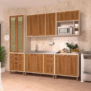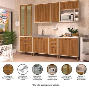 Ambiente composto por: - 1 Balcao de Pia sem Tampo para Cozinha 120cm 2 Portas de Abrir, 3 Gavetas Sofia Luciane Moveis 87 x 120 x 51,5 (Altura x Largura x Profundidade - cm) - 1 Balcao de Cozinha com Tampo 80 cm 2 Portas de Abrir 1 Prateleira Sofia Luciane Moveis 89,5 x 80 x 53 (Altura x Largura x Profundidade - cm) - 1 Armario Aereo de Cozinha 80cm 2 Portas 4 Prateleiras e Nicho Microondas Sofia Luciane Moveis 85 x 80 x 42 (Altura x Largura x Profundidade - cm) - 1 Armario Aereo de Cozinha 120 cm 3 Portas 5 Prateleiras Sofia Luciane Moveis 85 x 120 x 33 (Altura x Largura x Profundidade - cm) - 1 Paneleiro de Cozinha 70 cm 2 Portas com Vidro Reflecta Bronze 3 Gavetas Sofia Luciane Moveis 236 x 70 x 51,5 (Altura x Largura x Profundidade - cm)