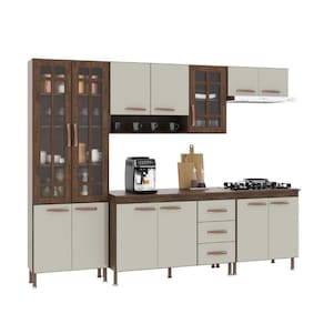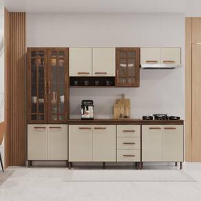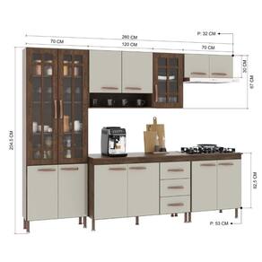QUANTIDADE DE GAVETAS: 3 | LARGURA (CM): 260 | QUANTIDADE DE PORTAS: 13 | MATERIAL: MDP | ALTURA (CM): 204,5 | PROFUNDIDADE (CM): 53 | TAMPO DO BALCÃO INCLUSO: Sim | QUANTIDADE DE PEÇAS: 5 | Tipo de móveis de cozinha: Completa | Requer Montagem: Sim | Materiais do Corpo: MDP | Inclui manual de montagem: Sim | Cor: Noce/Off-White